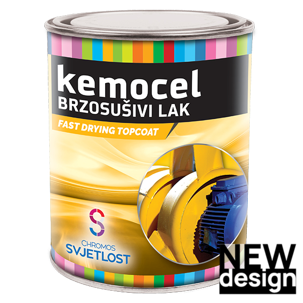 KEMOCEL brzosušivi lak je završni premaz za zaštitu i dekoraciju prije svega metalnih ali i drvenih površina. Zbog svojih posebnih antikorozivnih svojstva može se koristiti kao antikorozivni završni premaz. Odlikuje se velikom mehaničkom čvrstoćom, brzim sušenjem te otpornosti na atmosferilije, ulje i blage kemikalije.